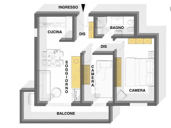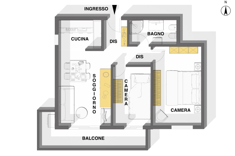 composto da un luminoso soggiorno con angolo cottura, perfetto per momenti